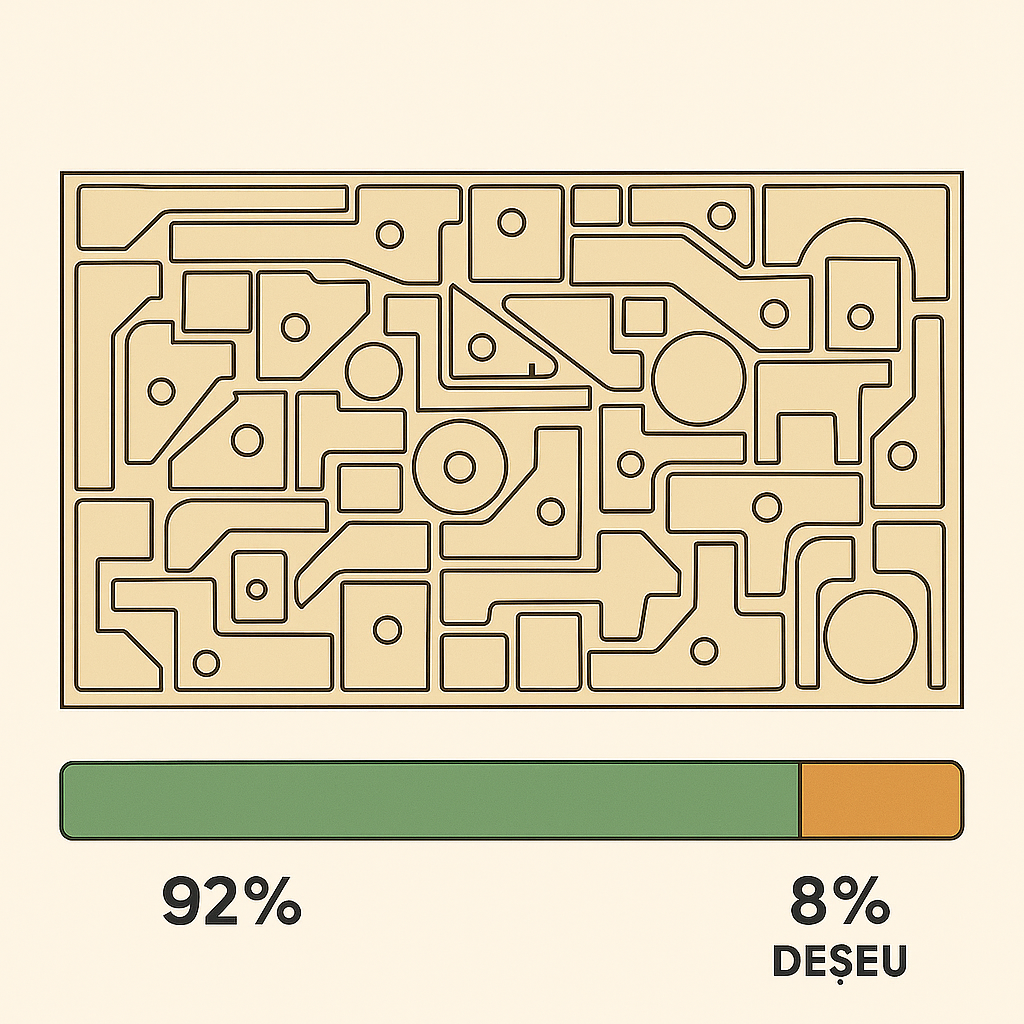Exemplu practic: prin true‑shape nesting se poate atinge ~92% utilizare a plăcii și numai ~8% deșeu, reducând costurile directe cu materialul.